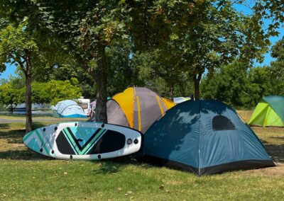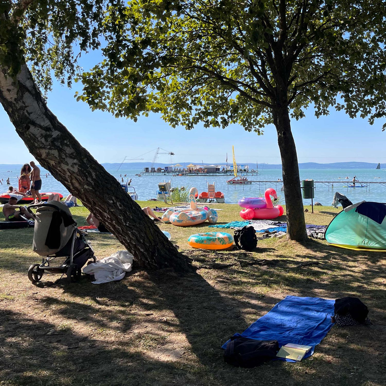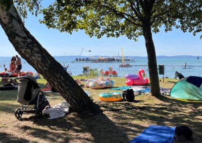 Der Balaton beginnt hier buchstäblich direkt vor deiner Tür – der Campingplatz und das Feriendorf liegen unmittelbar am Ufer. Es gibt mehrere direkte Zugänge zu einem der schönsten Strände von Siófok: dem Aranypart. Kein Schleppen, keine Logistik – einfach in die Flip-Flops schlüpfen und los: Panorama genießen, Wellenrauschen hören, am Wasser entspannen!
